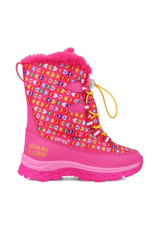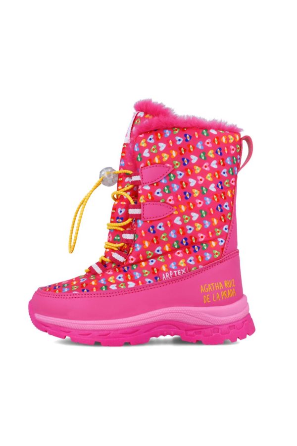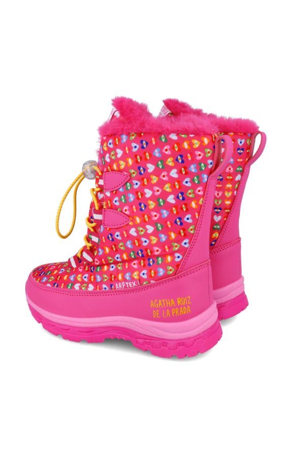 Bota de Apres-Ski estampado de corazones de colores sobre fondo fucsia, con forro calentito y resistentes al agua. Cierre con cordones ajustables. Tallaje desde el 28 al 34.