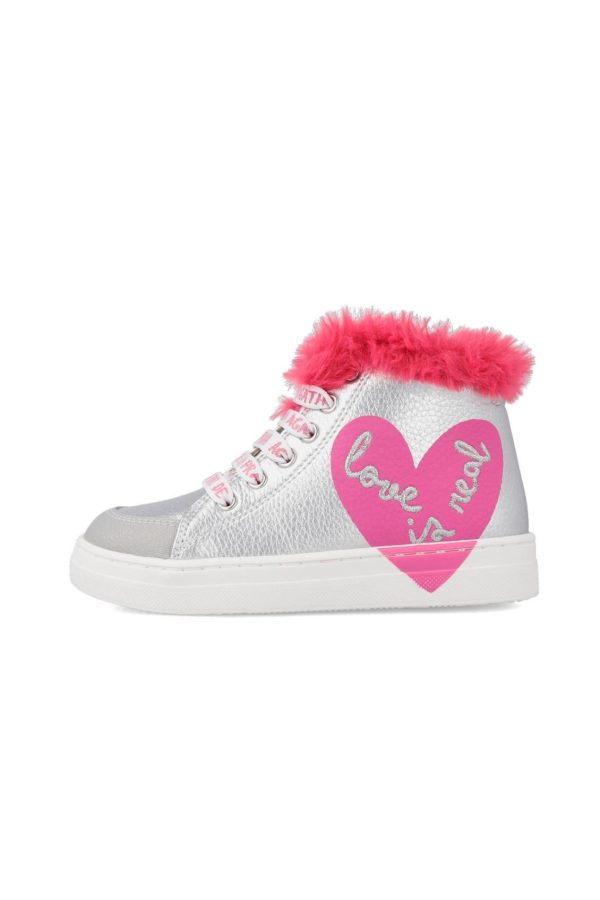 Botín en color plateado y un corazón fucsia y pelo del mismo color. Cierre lateral de cremallera. Tallaje desde el 24 al 36.