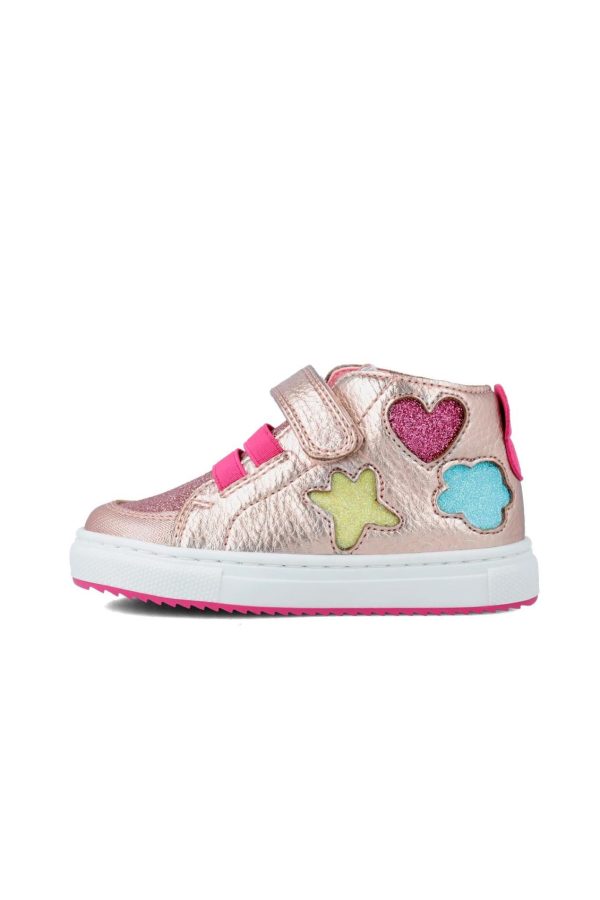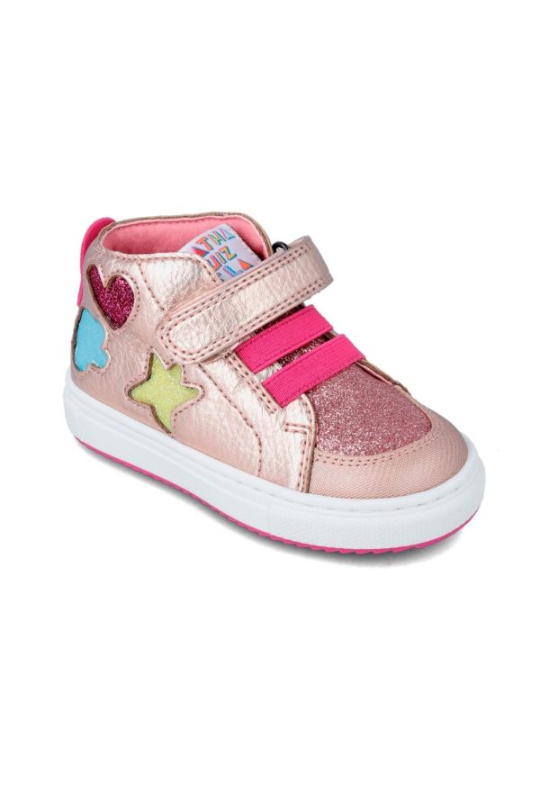 Botín estampado de color brillante en rosita apagado y cordones en fucsia y cierre superior de velcro. Cierre lateral de cremallera. Tallaje desde el 22 al 30.