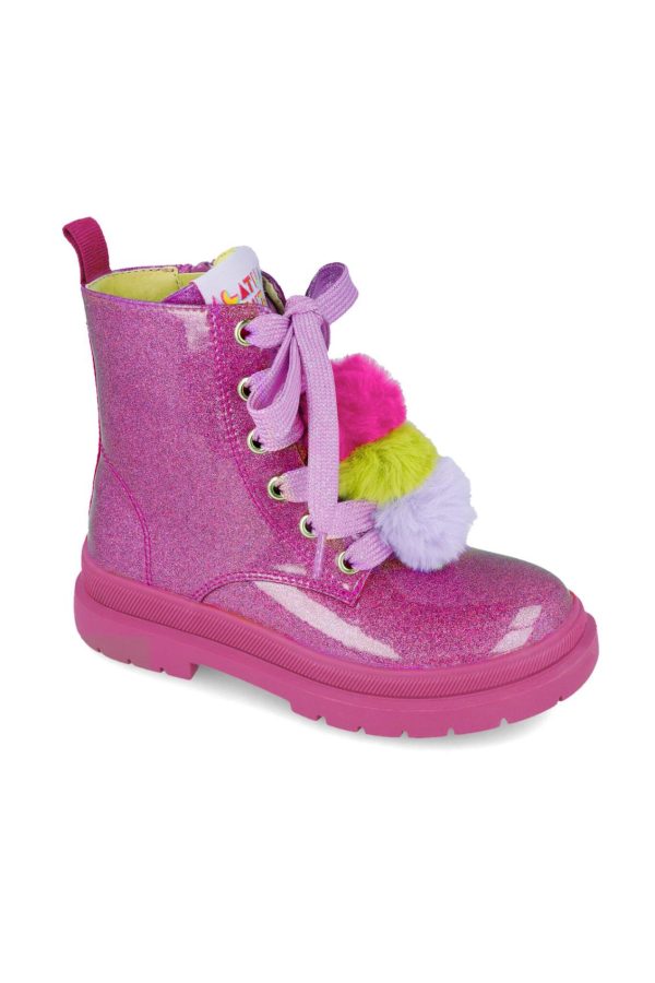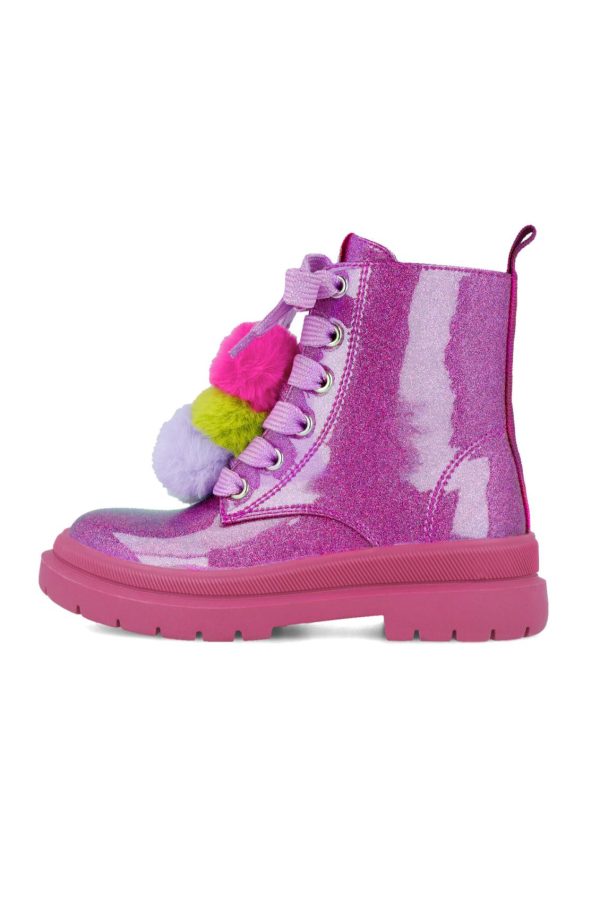 Botín gliter fucisa con 3 pompones de colores y los cordones de color fucsia. Cierre lateral de cremallera. Tallaje desde el 28 al 38.
