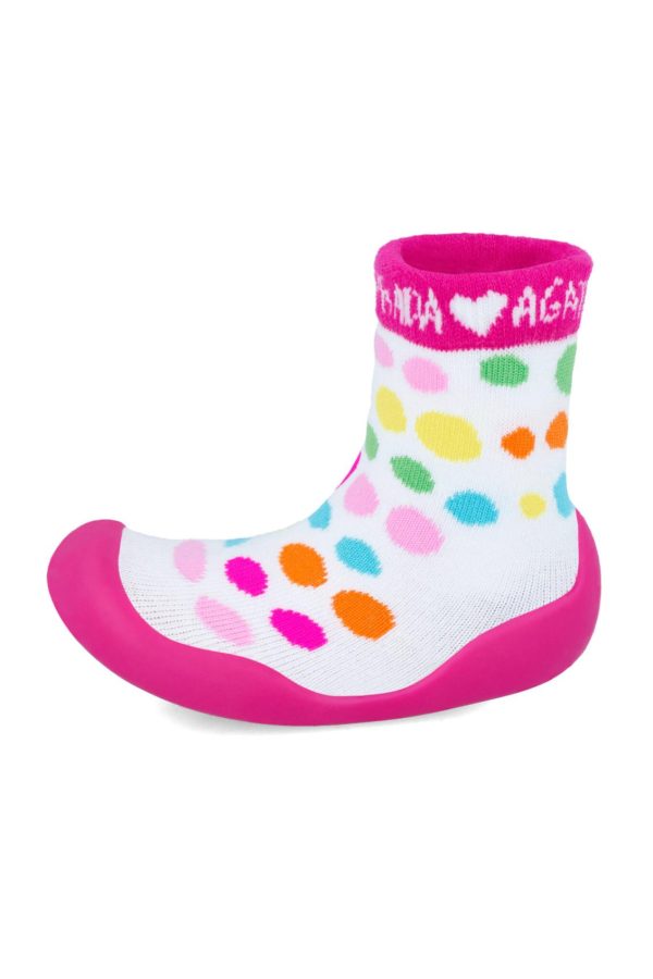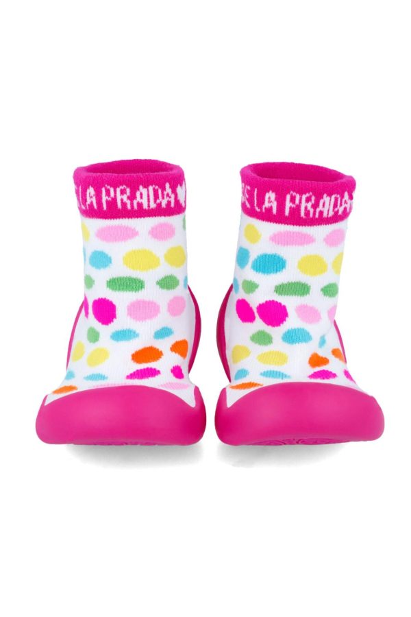 Calcetín de lycra en color blanco con topos colores, suela de color fucsia. Flexibles, plantilla antibacterias, antideslizantes, transpirables y puntera amplia. Tallaje desde el 18 al 23.