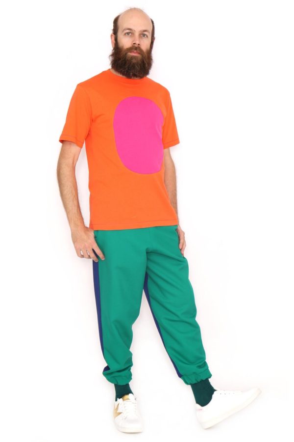 Camiseta de manga corta y cuello redondo en color naranja con un topo de color fucsia en el centro. Talla normal. Tallas: S – M – L – XL. Lavar a maquina máx 30ºC . No usar lejía/blanqueador. No usar secadora. Planchado máximo 110ºC. 100% ALGODON.