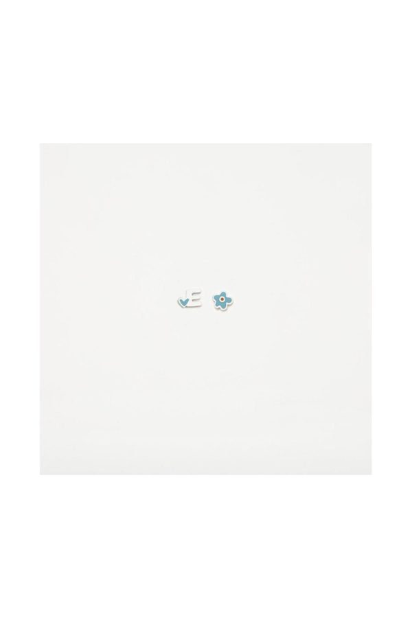Pendientes abecedario, letra E con un corazón celeste esmaltado y el pendiente que hace pareja es una flor con esmalte en el mismo color. Pendientes: Por razones de higiene, sólo se admiten devoluciones de artículos rotos o defectuosos de fábrica.