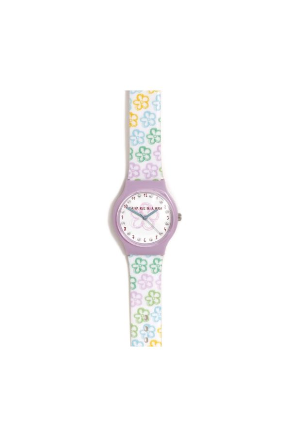 Reloj con caja de plástico, correa sándwich-band de PVC multicolor, hebilla de acero (maquinaria japonesa Seiko. Reloj pequeño de pila con correa de PVC. NO SE PUEDE MOJAR.