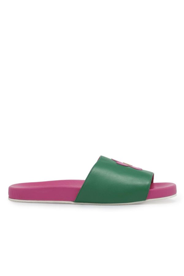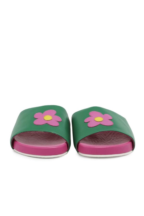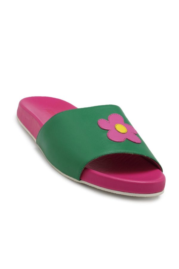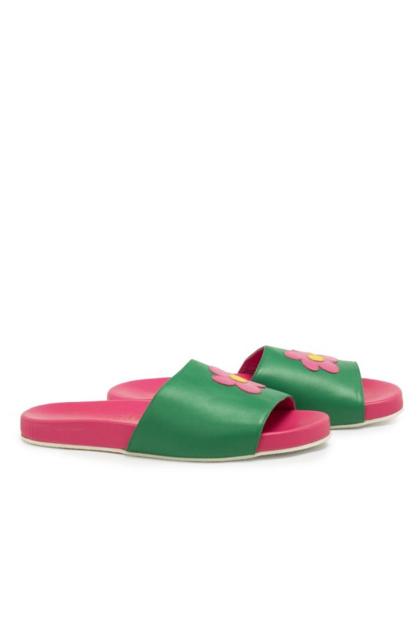 Sandalia de piel de pala de color verde con una flor fucsia en el centro. La suela de color fucsia y el tamaño de la cuña de 2,2 cm. Hecho en España. Material exterior: Piel. Material interior: Piel. Material suela: Sintético.