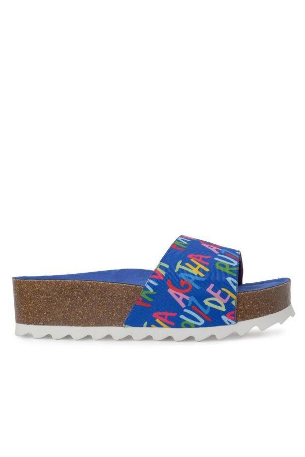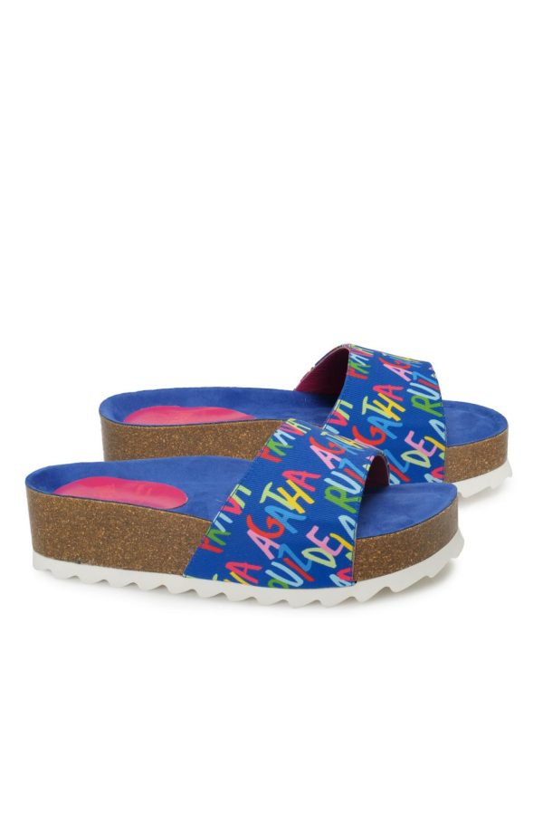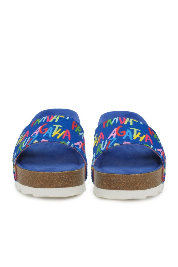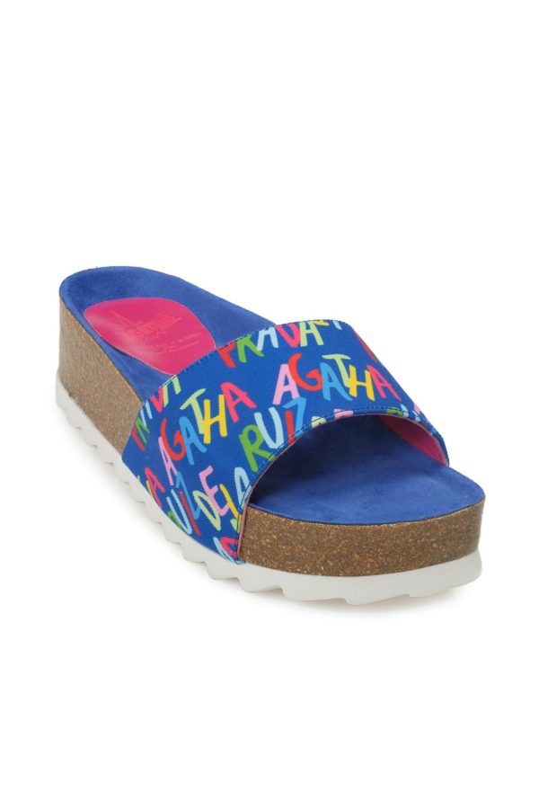 Sandalia tipo birkenstock de color azul estamapdo con letras de colores y suela de goma color blanco. Hecho en España. Tallaje desde la 36 hasta la 41.